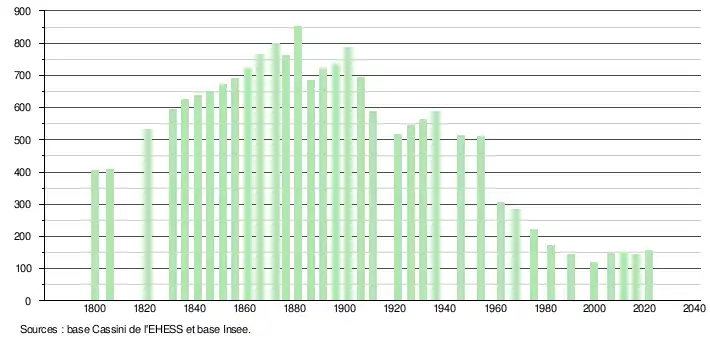 L'évolution du nombre d'habitants est connue à travers les recensements de la population effectués dans la commune depuis 1800. Pour les communes de moins de 10 000 habitants, une enquête de recensement portant sur toute la population est réalisée tous les cinq ans, les populations légales des années intermédiaires étant quant à elles estimées par interpolation ou extrapolation[7]. Pour la commune, le premier recensement exhaustif entrant dans le cadre du nouveau dispositif a été réalisé en 2006[8].