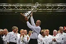 Ed Baird brandit le trophée de l'America's Cup, à Genève en 2007