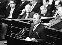 En 1864, Lassalle meurt prématurément, à la suite d'un duel lié à une affaire sentimentale. Même si elle demeure une force politique importante, l'ADAV ne parvient pas à se remettre de la disparition de son chef[122]. D'autres socialistes allemands comme Wilhelm Liebknecht, disciple de Marx ayant rapidement rompu avec Lassalle, ou August Bebel, reprochent par ailleurs à l'ADAV de diviser les forces démocratiques en Allemagne en s'appuyant exclusivement sur les ouvriers : en est créé le Parti populaire allemand (Deutsche Volkspartei) qui milite pour le suffrage universel mais se garde d'aliéner l'électorat bourgeois et limite son programme de réformes économiques aux coopératives de production[124].