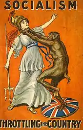 Dans les années 1880-1890, les socialistes français, dont le poids politique est tout d'abord assez faible, se répartissent entre différents groupes, syndicats et cercles derrière des personnalités comme Jules Guesde et le gendre de Marx Paul Lafargue (dirigeants du Parti ouvrier français, dont le programme, rédigé par Guesde, obtient l'imprimatur de Marx en personne[160]), Édouard Vaillant (Parti socialiste révolutionnaire), Paul Brousse (Fédération des travailleurs socialistes de France) ou Jean Allemane (Parti ouvrier socialiste révolutionnaire). Les différentes tendances socialistes françaises rivalisent entre elles, parfois violemment, entre autres sur la question des syndicats. Les guesdistes, de tendance marxiste, souhaiteraient subordonner le syndicat au parti, tandis que les allemanistes, attachés à un gouvernement par la base et au principe du mandat impératif, prônent le contraire[161]. L'anticapitalisme des socialistes français entraîne par ailleurs des passerelles avec certains courants antisémites : Édouard Drumont se présente volontiers à l'époque comme socialiste, et multiplie les contacts avec les guesdistes ou les socialistes indépendants, contribuant également à populariser l'idée de la « banque juive » chez les disciples de Blanqui ou de Proudhon[162].