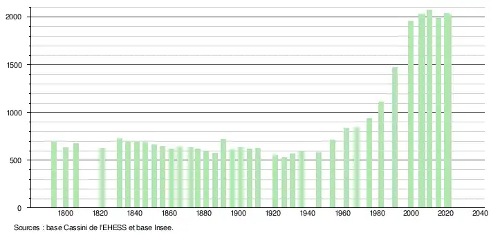 L'évolution du nombre d'habitants est connue à travers les recensements de la population effectués dans la commune depuis 1793. Pour les communes de moins de 10 000 habitants, une enquête de recensement portant sur toute la population est réalisée tous les cinq ans, les populations légales des années intermédiaires étant quant à elles estimées par interpolation ou extrapolation[48]. Pour la commune, le premier recensement exhaustif entrant dans le cadre du nouveau dispositif a été réalisé en 2005[49].