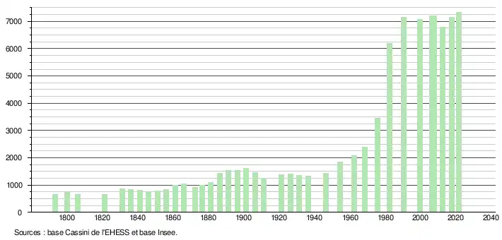 - Population municipale légale en vigueur au 1er janvier 2024, millésimée 2021, définie dans les limites territoriales en vigueur au 1er janvier 2023, date de référence statistique : 1er janvier 2021.