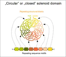 Lorsque les deux répétitions terminale du solénoïde interagissent entre elles, il se forme une structure topologiquement fermée et compacte. De tels domaines présentent généralement une symétrie circulaire, contrairement aux solénoïdes ouverts qui présentent seulement une symétrie de translation, et peuvent prendre une forme de roue. Compte tenu des limitations de cette structure, le nombre d'éléments répétés n'est pas arbitraire. Dans le cas des répétitions WD40, le nombre de répétitions peut aller de 4 à 10, le plus souvent entre 5 et 7[5]. Les motifs Kelch, les tonneaux β et le trèfle β sont d'autres exemples de ce type de structures. Les solénoïdes fermés fonctionnent souvent comme des modules d'interaction protéine-protéine : toutes les unités répétées doivent être généralement présentes afin de former le site de liaison au ligand si celui-ci est situé au centre ou dans l'axe du solénoïde.