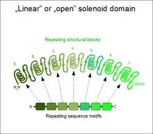 Lorsque les deux répétitions terminales du solénoïde n'interagissent pas entre elles, on a affaire à une structure dite ouverte, ou linéaire. De tels solénoïdes présentent généralement une forme en bâtonnet ou en croissant. Le nombre de répétitions qui les constituent va de 2 à plus de 50. Un avantage évident de ce type de structure est que les extrémités N-terminale et C-terminale peuvent être allongées par de nouvelles répétitions ou raccourcies par élimination de certaines d'entre elles sans que cela ait un impact significatif sur la stabilité de l'ensemble du domaine[4]. Ce type de domaine est extrêmement courant parmi les segments extracellulaires de récepteurs ou de protéines d'adhérence cellulaire. Ce sont par exemple la répétition EGF, la répétition cadhérine, la répétition riche en leucine, la répétition HEAT, la répétition ankyrine, la répétition armadillo, répétition tétratricopeptide, etc. Lorsqu'un domaine solénoïde linéaire participe à une interaction protéine-protéine, le site de liaison au ligand est fréquemment constitué d'au moins trois répétitions. Les unités répétées ne peuvent ainsi généralement pas assurer seules les fonctions de l'ensemble du domaine.