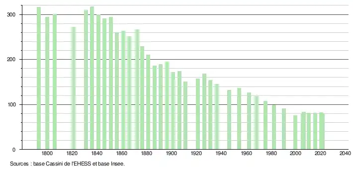 L'évolution du nombre d'habitants est connue à travers les recensements de la population effectués dans la commune depuis 1793. Pour les communes de moins de 10 000 habitants, une enquête de recensement portant sur toute la population est réalisée tous les cinq ans, les populations légales des années intermédiaires étant quant à elles estimées par interpolation ou extrapolation[14]. Pour la commune, le premier recensement exhaustif entrant dans le cadre du nouveau dispositif a été réalisé en 2005[15].
