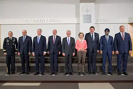 Lors d'une réunion des ministres des Affaires étrangères de l'OTAN le , le secrétaire d'État Rex Tillerson a appelé les Européens à payer davantage pour leur défense[7]. Sur le volet budgétaire, Donald Trump maintient une posture, jugée agressive sur la forme par les dirigeants européens[8], enjoignant tous les pays européens à atteindre le plus rapidement possible un niveau de dépenses militaires représentant 2% de leur PIB à l'horizon 2024, comme cela a été décidé en 2014[9].