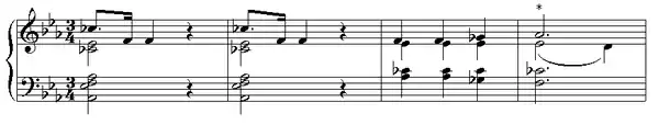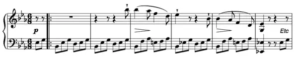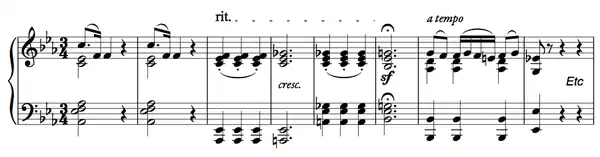 répété une fois, commence un ritardando dès la troisième mesure jusqu'à un point d'orgue à la cinquième mesure. Le thème continue par une phrase conclusive a tempo aboutissant à l'accord de mi