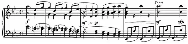 Le premier mouvement symbolise l'exil et les regrets. Il débute par l'égrenage lent de trois notes descendantes sous-titrées par le compositeur lui-même le-be-wohl (adieux). Après seize mesures débute allegro le thème principal, toujours construit sur le même motif rythmique de trois notes symbolisant le mot Lebewohl.