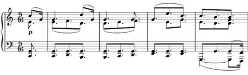 pris à la double croche[N 5]). Les valeurs de la cellule initiale sont plus brèves : le « croche/double croche » se transformant en « double croche/triple croche en triolet »[N 6]. Cette métamorphose rythmique très balancée et les harmonies employées (emprunts fréquents et passagers à d'autres tonalités) se conjuguent à un usage de la syncope qui préfigure les musiques très « swinguées » à venir, comme le ragtime et le jazz[22].