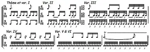 pris à la triple croche[N 7]). Les valeurs de la cellule rythmique de base sont à nouveau deux fois plus rapides que précédemment : la « double croche/triple croche en triolet » devenant « triple croche/quadruple croche en triolet ».