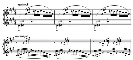 Marcel Marnat relève les indications de jeu du compositeur : « Très vite mais pas précipité ou encore Sans prudence et sans merci ![M 10] » de telle sorte que, « commencée dans le ton endeuillé de fa dièse mineur, l'œuvre évolue vers fa dièse majeur donc vers un climat de jubilation[M 10] ».