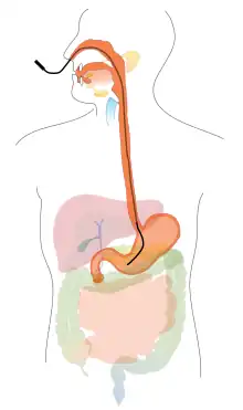 L'introduction de la sonde se fait par une des deux narines. La sonde passant sous le cornet nasal inférieur, est guidée vers le fond de la cavité nasale. Elle se courbe au niveau du nasopharynx pour redescendre ensuite vers le carrefour oropharyngé et passer par l'épiglotte. La sonde est glissée le long de l'œsophage pour atteindre l'estomac, parfois jusqu'à la région post-pylorique.
