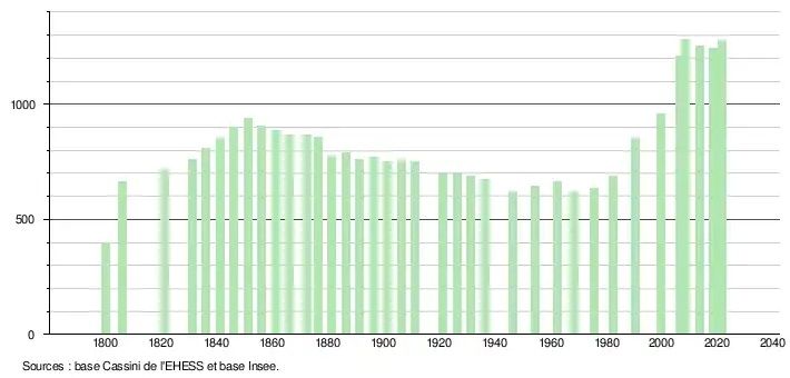 L'évolution du nombre d'habitants est connue à travers les recensements de la population effectués dans la commune depuis 1800. Pour les communes de moins de 10 000 habitants, une enquête de recensement portant sur toute la population est réalisée tous les cinq ans, les populations légales des années intermédiaires étant quant à elles estimées par interpolation ou extrapolation[21]. Pour la commune, le premier recensement exhaustif entrant dans le cadre du nouveau dispositif a été réalisé en 2008[22].