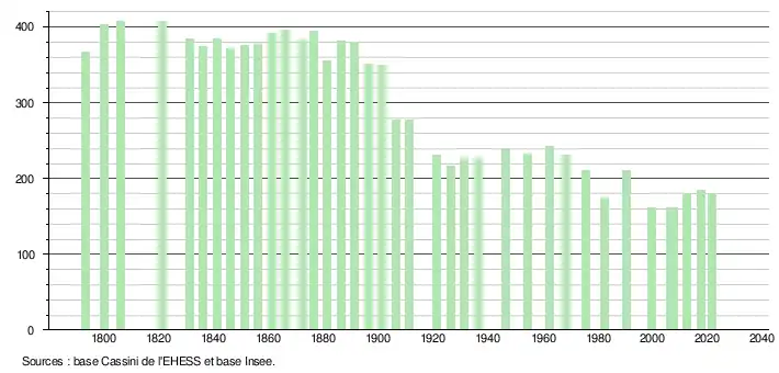 L'évolution du nombre d'habitants est connue à travers les recensements de la population effectués dans la commune depuis 1793. Pour les communes de moins de 10 000 habitants, une enquête de recensement portant sur toute la population est réalisée tous les cinq ans, les populations légales des années intermédiaires étant quant à elles estimées par interpolation ou extrapolation[20]. Pour la commune, le premier recensement exhaustif entrant dans le cadre du nouveau dispositif a été réalisé en 2007[21].