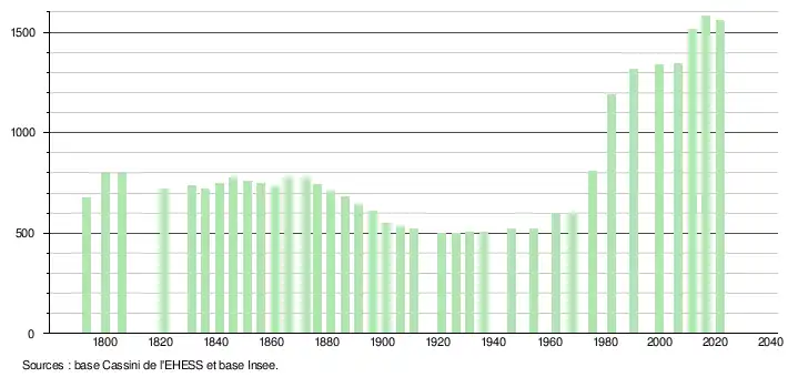 L'évolution du nombre d'habitants est connue à travers les recensements de la population effectués dans la commune depuis 1793. Pour les communes de moins de 10 000 habitants, une enquête de recensement portant sur toute la population est réalisée tous les cinq ans, les populations légales des années intermédiaires étant quant à elles estimées par interpolation ou extrapolation[16]. Pour la commune, le premier recensement exhaustif entrant dans le cadre du nouveau dispositif a été réalisé en 2006[17].