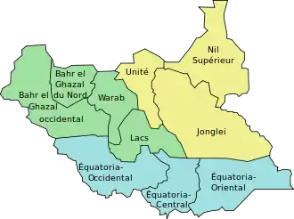 Jusqu'en 2015 puis à nouveau à partir de février 2020, le Soudan du Sud a été divisé en dix États correspondant aux trois régions historiques du Soudan :