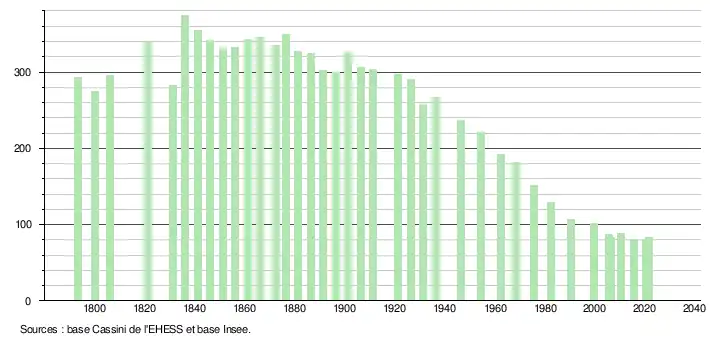 L'évolution du nombre d'habitants est connue à travers les recensements de la population effectués dans la commune depuis 1793. Pour les communes de moins de 10 000 habitants, une enquête de recensement portant sur toute la population est réalisée tous les cinq ans, les populations légales des années intermédiaires étant quant à elles estimées par interpolation ou extrapolation[13]. Pour la commune, le premier recensement exhaustif entrant dans le cadre du nouveau dispositif a été réalisé en 2005[14].