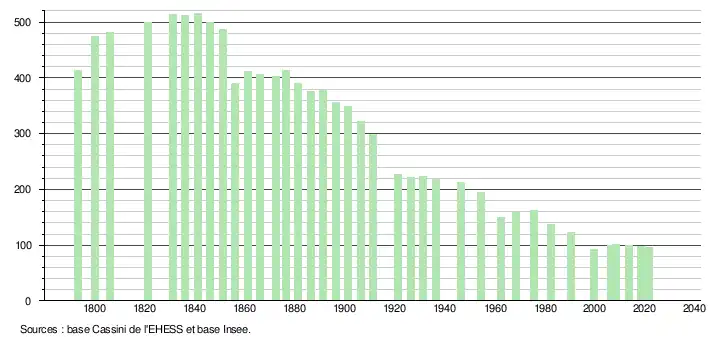 L'évolution du nombre d'habitants est connue à travers les recensements de la population effectués dans la commune depuis 1793. Pour les communes de moins de 10 000 habitants, une enquête de recensement portant sur toute la population est réalisée tous les cinq ans, les populations légales des années intermédiaires étant quant à elles estimées par interpolation ou extrapolation[14]. Pour la commune, le premier recensement exhaustif entrant dans le cadre du nouveau dispositif a été réalisé en 2008[15].