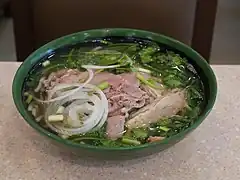 - Phở – nouilles de riz blanches dans un bouillon de bœuf avec de fines tranches de bœuf, garnies d'ingrédients comme le ciboule, oignons, feuilles de coriandre, ngo gai ("herbe de feuilles à dent"), et menthe[7]. Le basilic, citron ou citron vert, pousses de soja, et piments sont typiquement servis à part sur une assiette, ce qui permet aux clients d'ajuster le goût selon leurs préférences. La sauce hoisin et sauce aux anchois sont parfois ajoutées. Le bánh đa au nord du pays ressemble au phở.