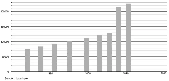 - Population municipale légale en vigueur au 1er janvier 2024, millésimée 2021, définie dans les limites territoriales en vigueur au 1er janvier 2023, date de référence statistique : 1er janvier 2021.