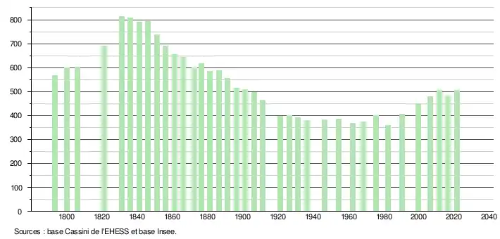 L'évolution du nombre d'habitants est connue à travers les recensements de la population effectués dans la commune depuis 1793. Pour les communes de moins de 10 000 habitants, une enquête de recensement portant sur toute la population est réalisée tous les cinq ans, les populations légales des années intermédiaires étant quant à elles estimées par interpolation ou extrapolation[14]. Pour la commune, le premier recensement exhaustif entrant dans le cadre du nouveau dispositif a été réalisé en 2006[15].