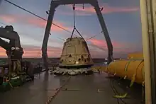 - Pour des expériences scientifiques, la capsule comprend une baie latérale non pressurisée (D) d'une contenance de 0,1 m3 qui permet, grâce à une ouverture recouverte par une trappe mobile, n d'exposer des expériences scientifiques au vide. Celles-ci peuvent être récupérées après le retour à Terre[13].