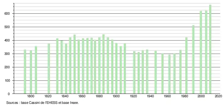 L'évolution du nombre d'habitants est connue à travers les recensements de la population effectués dans la commune depuis 1793. À partir du , les populations légales des communes sont publiées annuellement dans le cadre d'un recensement qui repose désormais sur une collecte d'information annuelle, concernant successivement tous les territoires communaux au cours d'une période de cinq ans. Pour les communes de moins de 10 000 habitants, une enquête de recensement portant sur toute la population est réalisée tous les cinq ans, les populations légales des années intermédiaires étant quant à elles estimées par interpolation ou extrapolation[4]. Pour la commune, le premier recensement exhaustif entrant dans le cadre du nouveau dispositif a été réalisé en 2005[5],[Note 1].