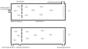 Dans le cas d’un flux unidirectionnel, le gaz transporteur introduit dans le tube de dérive du côté du détecteur et celui introduit dans la région d’ionisation vont dans la même direction, soit dans la direction opposée du détecteur[1].