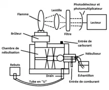 Grâce à une entrée d’air située au début de l’instrument et à l’effet Venturi, l’échantillon est aspiré par le tube. L’échantillon est projeté sur la bille d’impact, ce qui crée de petites gouttelettes. Dans le cas d’un brûleur à prémélange, l’entrée des gaz se situe dans la chambre de nébulisation. Le gaz et les gouttelettes sont donc mélangés. La totalité de l’échantillon ne se rend pas vers le brûleur. Le reste, soit les plus grosses gouttes qui se frappent sur les parois ou sur les hélices, va dans le drain. Les gouttelettes vont dans le brûleur, où se trouve la flamme. À cet endroit, le mélange de gaz brûle tandis que les ions métalliques sont atomisés et subissent le processus d’excitation. La lumière émise par ce dernier est dirigée vers une lentille qui la converge vers le filtre. Ce dernier, qui est choisi par l'analyste en fonction du métal à quantifier, laisse passer la lumière à une longueur d’onde précise. Cette lumière atteint un photodétecteur et photomultiplicateur pour ensuite afficher les résultats à un système de lecture[10].