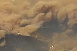 Sur des eaux extrêmement polluées et mal épurées, les filaments en suspension peuvent parfois sécher au soleil à la surface de l'eau et y former des croûtes.