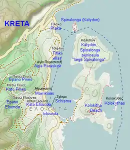 Spinalonga est située en Crète à l’est de la ville d'Elounda, au-delà d’anciens marais salants et d’un étroit chenal artificiel enjambé par un pont, à l'est du village maritime de Pláka, situé à 5 km au nord d'Elounda, juste en face de la pointe nord de la presqu'île. Spinalonga a été rebaptisée Kalydón par un décret de 1954, nom emprunté à une ville d'Étolie disparue[1].