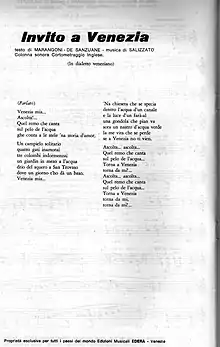 Invitation à Venise est le titre d'une vieille chanson en dialecte vénitien de Emilio De Sanzuane-Giovanni Marangoni, citant notamment le Squero San Trovaso.