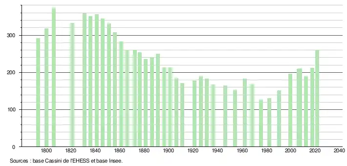 L'évolution du nombre d'habitants est connue à travers les recensements de la population effectués dans la commune depuis 1793. Pour les communes de moins de 10 000 habitants, une enquête de recensement portant sur toute la population est réalisée tous les cinq ans, les populations légales des années intermédiaires étant quant à elles estimées par interpolation ou extrapolation[25]. Pour la commune, le premier recensement exhaustif entrant dans le cadre du nouveau dispositif a été réalisé en 2007[26].