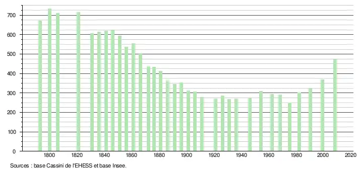 - Dans le tableau des recensements et le graphique, par convention dans Wikipédia, le principe a été retenu, pour les populations légales postérieures à 1999 de n’afficher dans le tableau des recensements et le graphique que les populations correspondant à l'année 2006, première population légale publiée calculée conformément aux concepts définis dans le décret no 2003-485 du 5 juin 2003, et les années correspondant à une enquête exhaustive de recensement pour les communes de moins de 10 000 habitants, ainsi que la dernière population légale publiée par l’Insee.