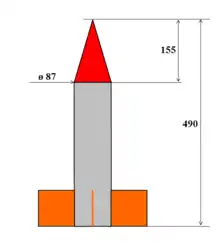 Comme le montre l'image ci-contre, cette ogive est biconique, sa partie blanche (un cône de papier enroulé) se raccordant avec une partie tronconique.