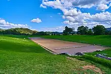 - La piste rectiligne constitue un rectangle de 212 m. L'introduction dans le programme olympique, de la course du double stade (diaulos, l'équivalent des 400 mètres actuels) en 724 avant J.-C., de 24 stades (dolichos) en 720 avant J.-C., contraint les coureurs à effectuer des allers-retours et des virages à 180°. Selon certains auteurs antiques, « chaque coureur tourne autour d'un piquet placé à l'extrémité de son couloir. Selon d'autres, l'ensemble des concurrents vire autour d'un poteau ou d'une borne unique. Ces deux interprétations, apparemment contradictoires, correspondent peut-être à des époques successives, révélant ainsi une révolution (dans tous les sens du terme) : l'apparition, de fait, de la piste circulaire constituée de deux lignes droites distinctes raccordées par des virages semi-circulaires. D'espace fini, la piste devient un espace de course sur des distances pouvant être infinies. Dès lors, la piste peut « s'émanciper » de la distance de course conventionnelle : le stade pourrait ne plus mesurer un stade ». Cf François Vigneau, Les espaces du sport, Presses universitaires de France, , p. 32