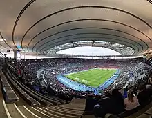 Le Stade de France est le plus grand stade français, comprenant 80 698 places[3] en configuration football/rugby. Il se situe dans le quartier de la Plaine Saint-Denis à Saint-Denis, dans la proche banlieue nord de Paris. Il est l'œuvre de quatre architectes : Michel Macary, Aymeric Zublena, Michel Regembal et Claude Costantini. L'architecture de ce stade s'inspire du Worldport, un terminal de la compagnie aérienne américaine Pan Am qui se situait à l'aéroport international John-F.-Kennedy de New York[4].