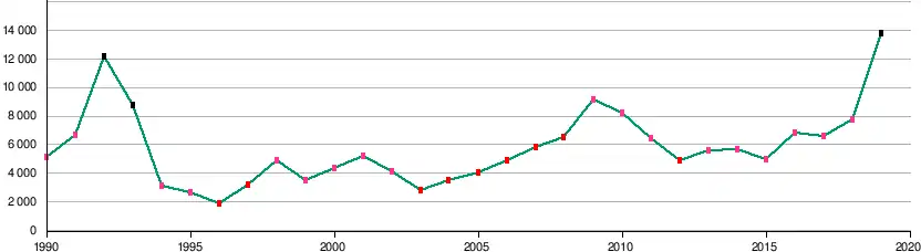Les points noirs indiquent les saisons jouées en D1, les points roses indiquent les saisons jouées en D2 et les points rouges indiquent les saisons jouées en D3.