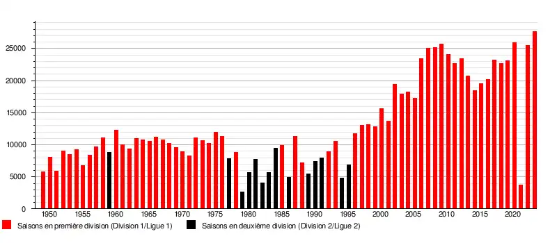 Le Stade rennais FC est l'un des vingt clubs qui disputent le premier championnat de France professionnel de l'histoire en 1932-1933. Hors période de guerre, il a depuis toujours évolué en Ligue 1 ou en Ligue 2, sans descendre dans les divisions inférieures[80]. Au total, le Stade rennais FC a disputé soixante-quatre saisons au plus haut niveau[note 6], ce qui le place parmi les cinq meilleurs clubs français sur ce critère[157].
