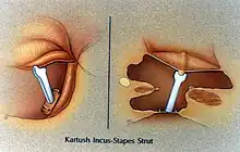 Un piston, correspondant à une prothèse d'étrier, est ensuite positionné, le plus souvent sur la branche descendante de l'enclume, pour remplacer l'étrier bloqué et retiré.