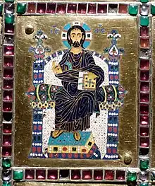 Au centre du couvercle se trouvent neuf plaques d’émaux, entourées d’une bande décorative. La rangée centrale des images est une déesis : au centre est un Christ trônant (Christ pantocrator), à gauche Jean l'Évangéliste accompagné de l'archange Gabriel, à droite Marie accompagnée de l'archange Michel. Les anges portent des habits de la cour byzantine, Marie et Jean sont vêtus de pourpre impériale. Dans les rangées au-dessus et en dessous, des saints par paires. Les registres du haut et du bas présentent les douze apôtres, groupés par deux. Les plaques centrales sont entourées d'un bandeau ornemental constellé de pierres où sont enchâssés des médaillons de huit saints en buste. Deux plaques décorées de trois rosettes figurées par des petits grenats et constellées de pierres se trouvent au-dessus et en dessous de ce cadre. Le tout est entouré de dix bandes rectangulaires[3]. Le dos du couvercle montre une croix posée sur un socle, en argent doré repoussé. Au pied de l'arbre pousse une acanthe.