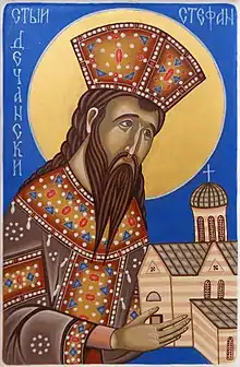 Stefan Uroš III Dečanski Nemanjic, en serbe cyrillique Стефан Урош III Дечански Немањић français: Étienne Decanski, roi de Serbie de 1321 à 1331, souverain serbe de la dynastie des Nemanjić, fils du roi Milutin, et saint de l’Église orthodoxe.