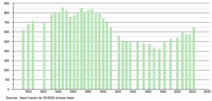 L'évolution du nombre d'habitants est connue à travers les recensements de la population effectués dans la commune depuis 1793. Pour les communes de moins de 10 000 habitants, une enquête de recensement portant sur toute la population est réalisée tous les cinq ans, les populations légales des années intermédiaires étant quant à elles estimées par interpolation ou extrapolation[16]. Pour la commune, le premier recensement exhaustif entrant dans le cadre du nouveau dispositif a été réalisé en 2006[17].