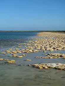 - une variété « pustuleuse » à Entophysalis, la plus souvent exondée par la marée. Ces stromatolithes sont peu ou pas laminés et moins denses, en blocs globalement circulaires d'un mètre de large et de dix centimètres de hauteur. Ils sont essentiellement produits par la bactérie Entophysalis major, qui pourrait descendre d'Entophysalis, ce qui en ferait la lignée vivante directe la plus ancienne connue sur la terre pour un organisme non-fossile.