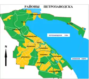| • Medvejiegorsk (Медвежьегорск, Medvežjegorsk) • Pinduinen (Пиндуши, Pinduši) • Poventsa (Повенец, Povenets) | • Paatene (Паданы, Padany) • Sunku (Шуньга, Šunga) • Suurlahti (Великая Губа, Velikaja Guba) • Tolvoja (Толвуя, Tolvuja) • Tsolmuinen (Чёлмужи, Tšolmuži) • Tšopina (Чёбино, Tšobino) | |