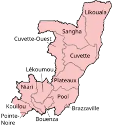 Le département, prévu par l’article 174 de la Constitution du , est substitué à la région telle que prévue par la loi n°9-95 du [1]. Avant 2003, le territoire est divisé en dix régions : la Likouala, la Sangha, la Cuvette, la Cuvette-ouest, les Plateaux, le Pool, la Lékoumou, la Bouenza, le Niari, le Kouilou.
