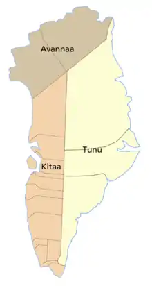 À ces cinq communes s'ajoutent les zones non-incorporées du Parc national du Nord-Est du Groenland (972 000 km2) et de la base aérienne de Thulé, enclave de la commune d'Avannaata.