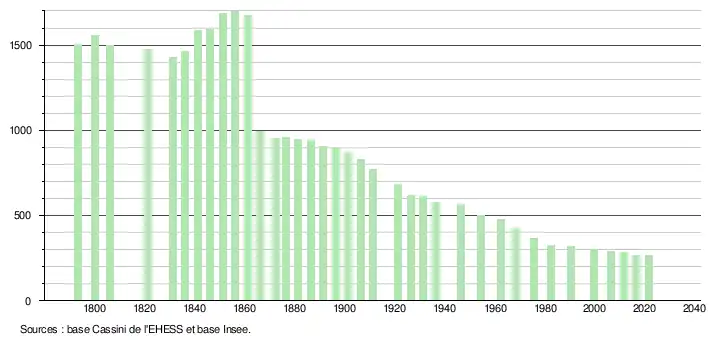 L'évolution du nombre d'habitants est connue à travers les recensements de la population effectués dans la commune depuis 1793. Pour les communes de moins de 10 000 habitants, une enquête de recensement portant sur toute la population est réalisée tous les cinq ans, les populations légales des années intermédiaires étant quant à elles estimées par interpolation ou extrapolation[24]. Pour la commune, le premier recensement exhaustif entrant dans le cadre du nouveau dispositif a été réalisé en 2006[25].
