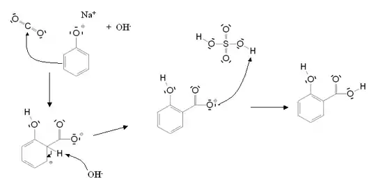 Au cours de la première étape (absente sur le schéma), le phénol réagit avec de la soude pour former le phénolate de sodium et des ions HO−. Le phénolate réagit ensuite avec le dioxyde de carbone par substitution électrophile aromatique, le centre électrophile étant ici l'atome de carbone du CO2. Les ions HO− formés au cours de la première étape assistent la restauration de l'aromaticité. Le composé obtenu étant la base conjuguée de l'acide carboxylique, la dernière étape consiste en une réaction acide-base avec l'acide sulfurique.