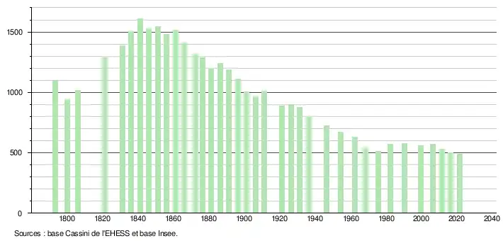 L'évolution du nombre d'habitants est connue à travers les recensements de la population effectués dans la commune depuis 1793. Pour les communes de moins de 10 000 habitants, une enquête de recensement portant sur toute la population est réalisée tous les cinq ans, les populations légales des années intermédiaires étant quant à elles estimées par interpolation ou extrapolation[15]. Pour la commune, le premier recensement exhaustif entrant dans le cadre du nouveau dispositif a été réalisé en 2006[16].